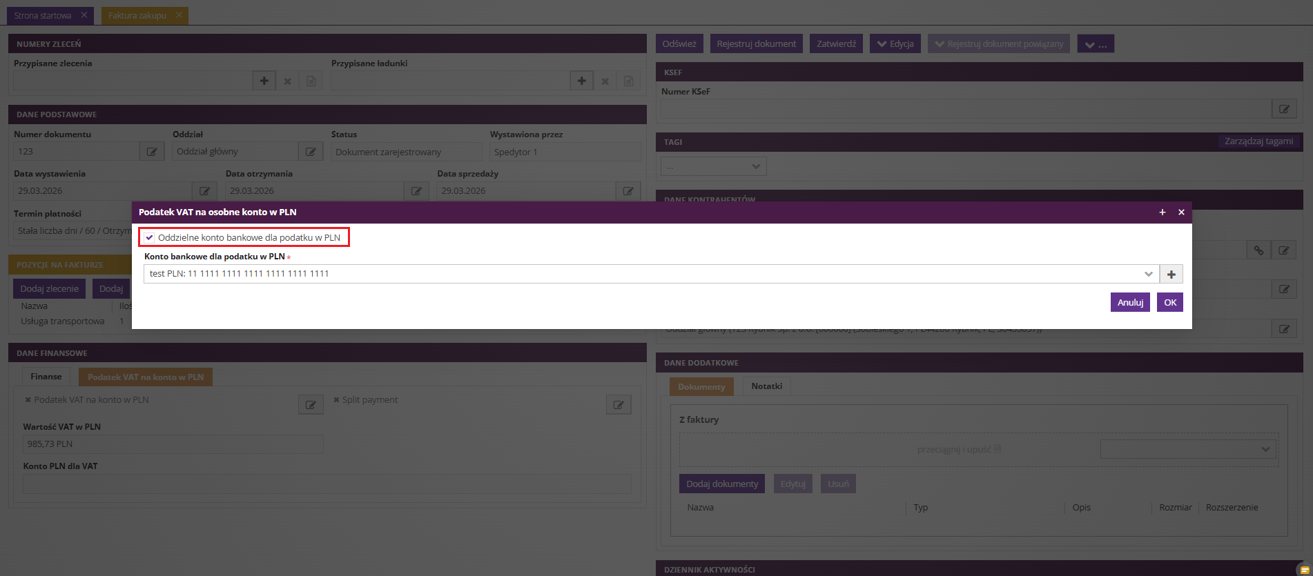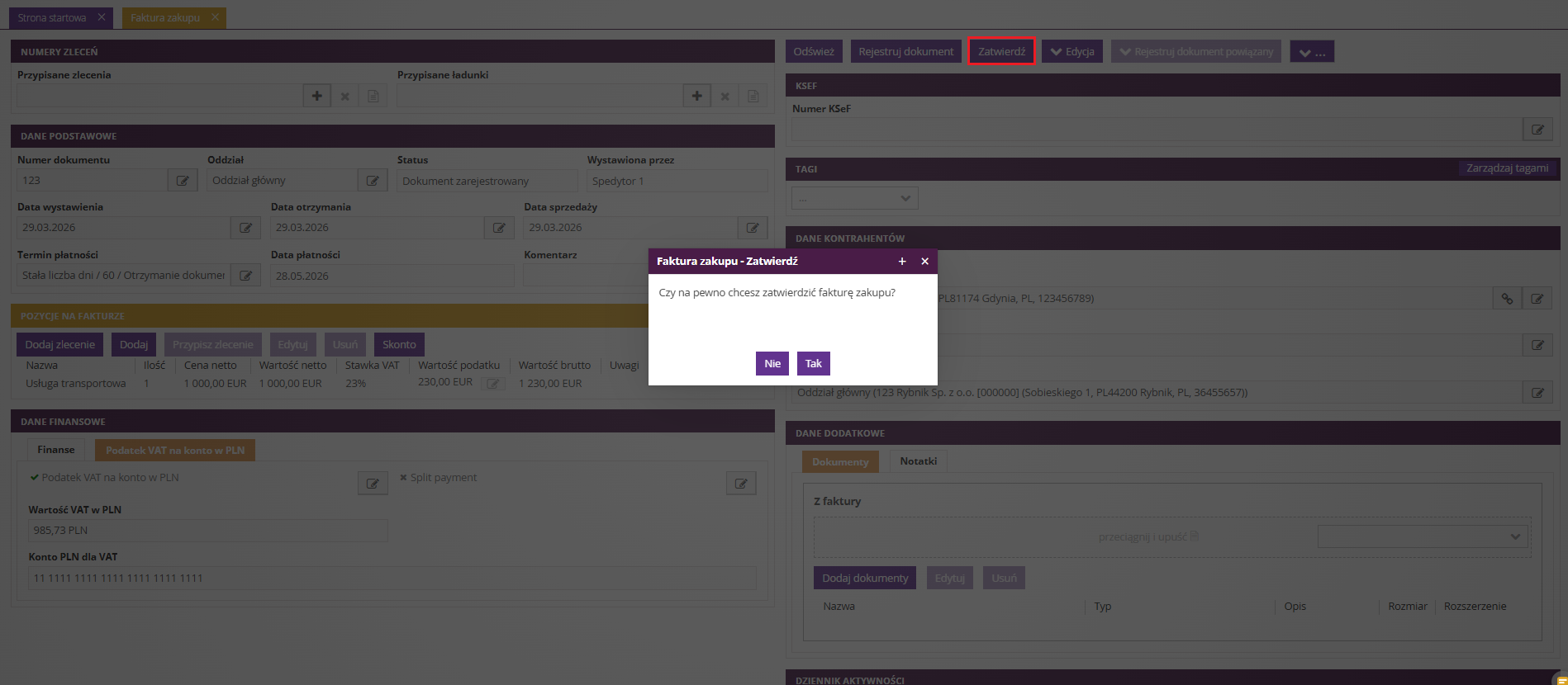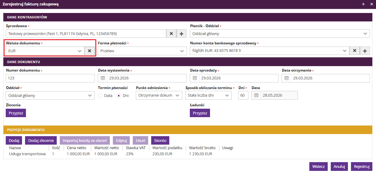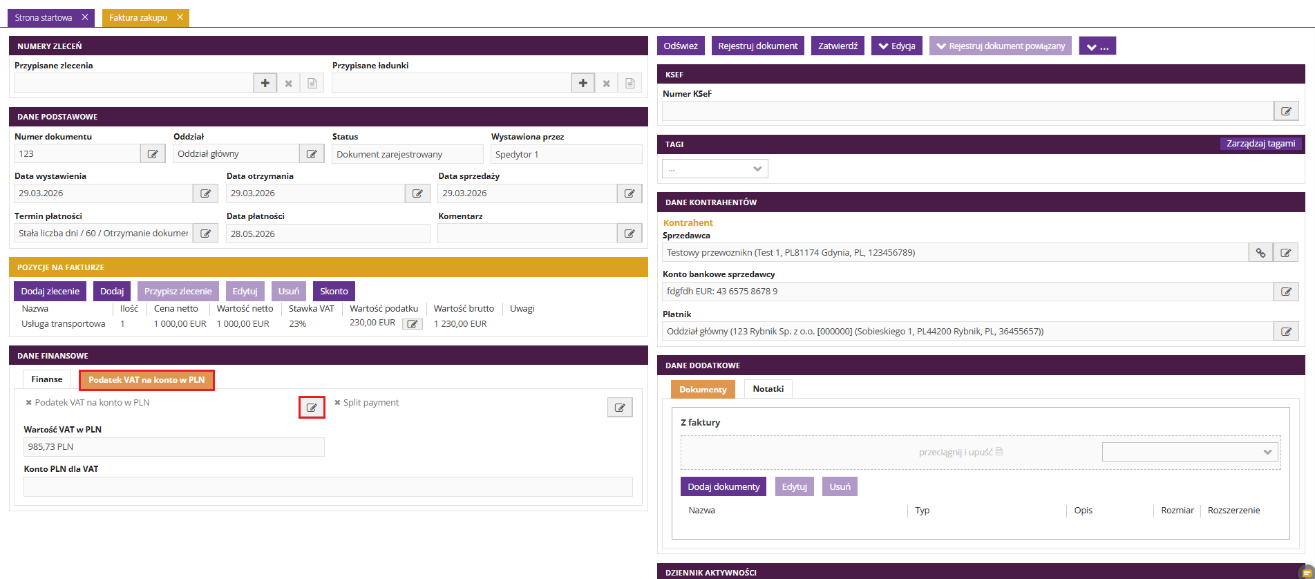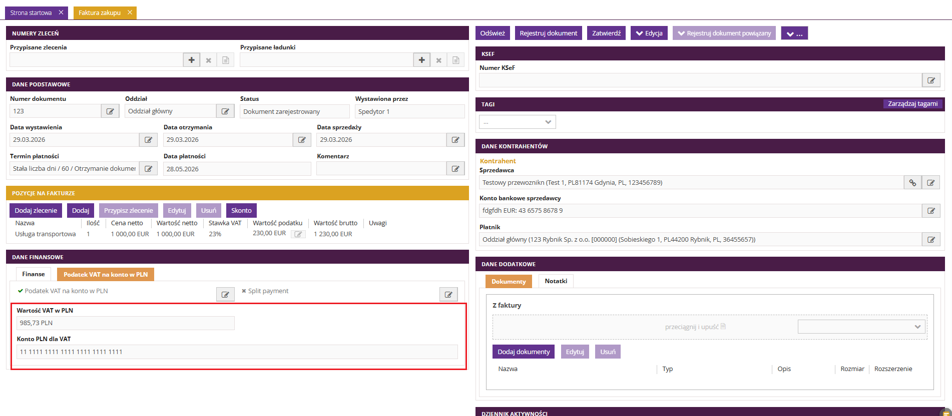 W systemie fireTMS istnieje możliwość zarejestrowania faktury zakupowej z VAT na konto w PLN.