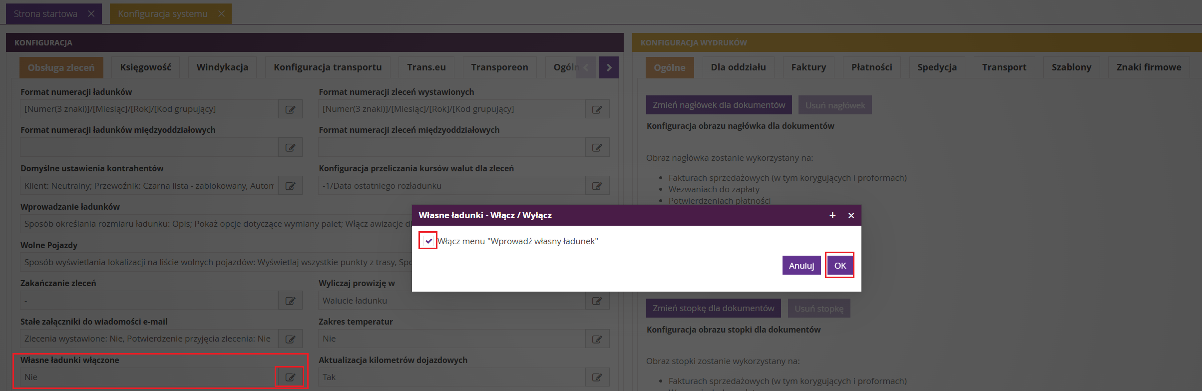 Aby dodać taki ładunek, najpierw trzeba aktywować odpowiednie ustawienie w Konfiguracja >> Konfiguracja systemu >> zakładka Obsługa zleceń >> edycja pola Własne ładunki włączone >> w nowym oknie należy włączyć checkbox Włącz menu “Wprowadź własny ładunek” >> OK.