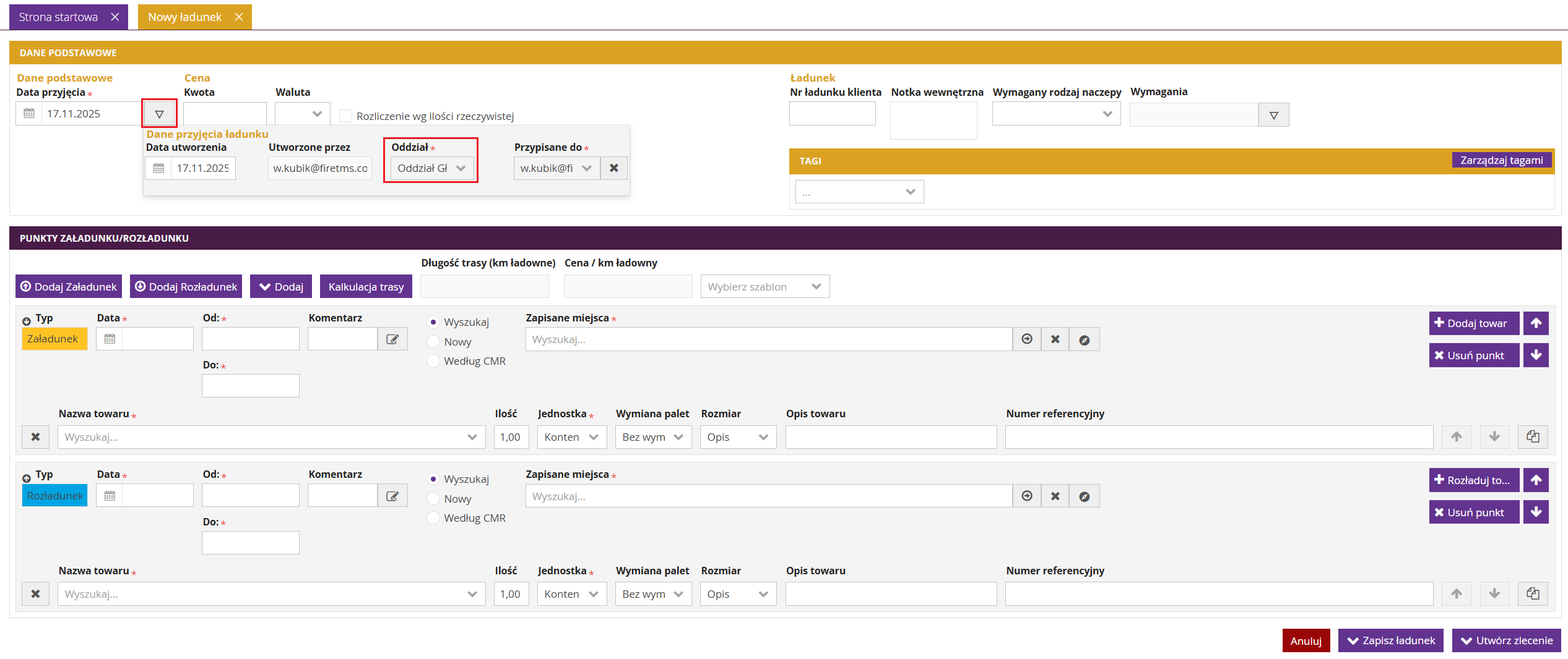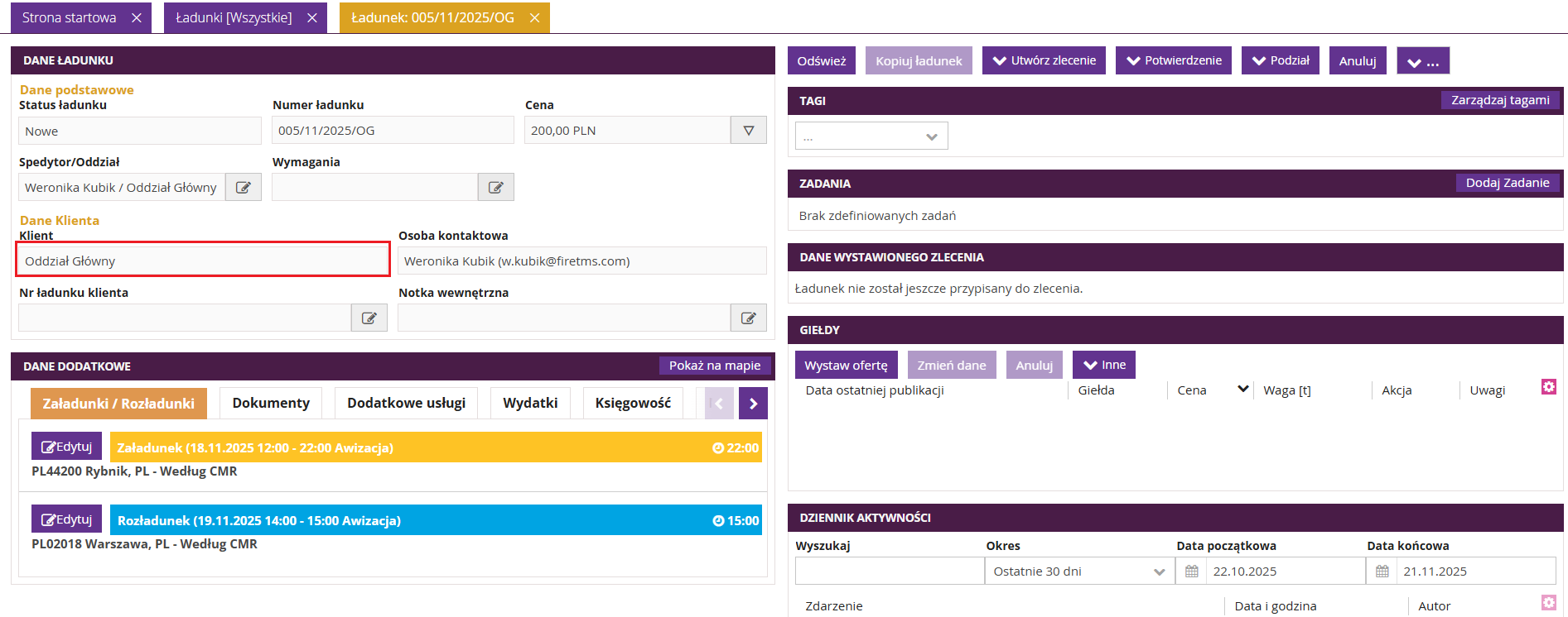 W oknie tworzenia ładunku nie ma dostępnego pola do wybrania klienta - zamiast tego należy wskazać odpowiedni oddział – to właśnie on będzie widoczny jako klient w utworzonym ładunku.