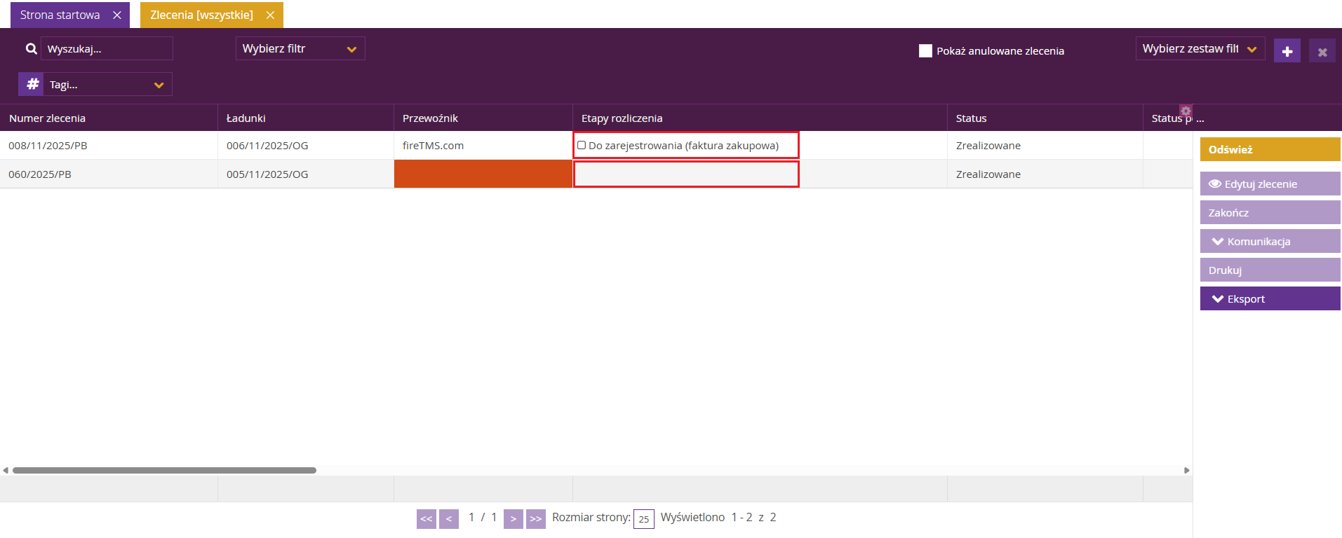 w kolumnie Etapy rozliczenia pojawi się informacja o konieczności zarejestrowania dokumentu zakupu od przewoźnika. System nie utworzy szkicu faktury sprzedaży.w przypadku zlecenia transportowego: