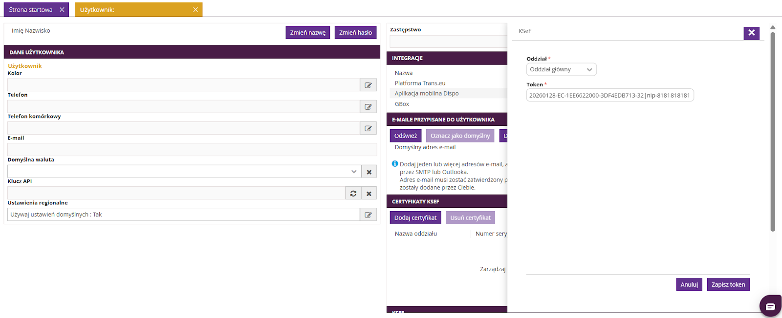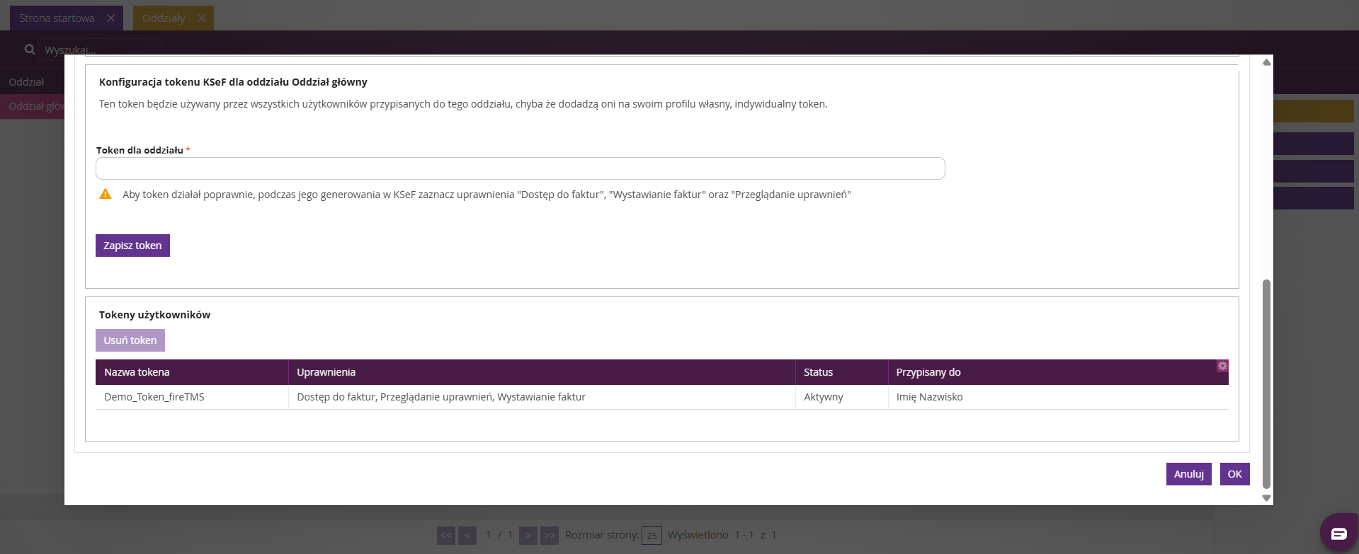 System fireTMS umożliwia dodanie tokenu KSeF zarówno na poziomie oddziału, jak i indywidualnie dla użytkownika.