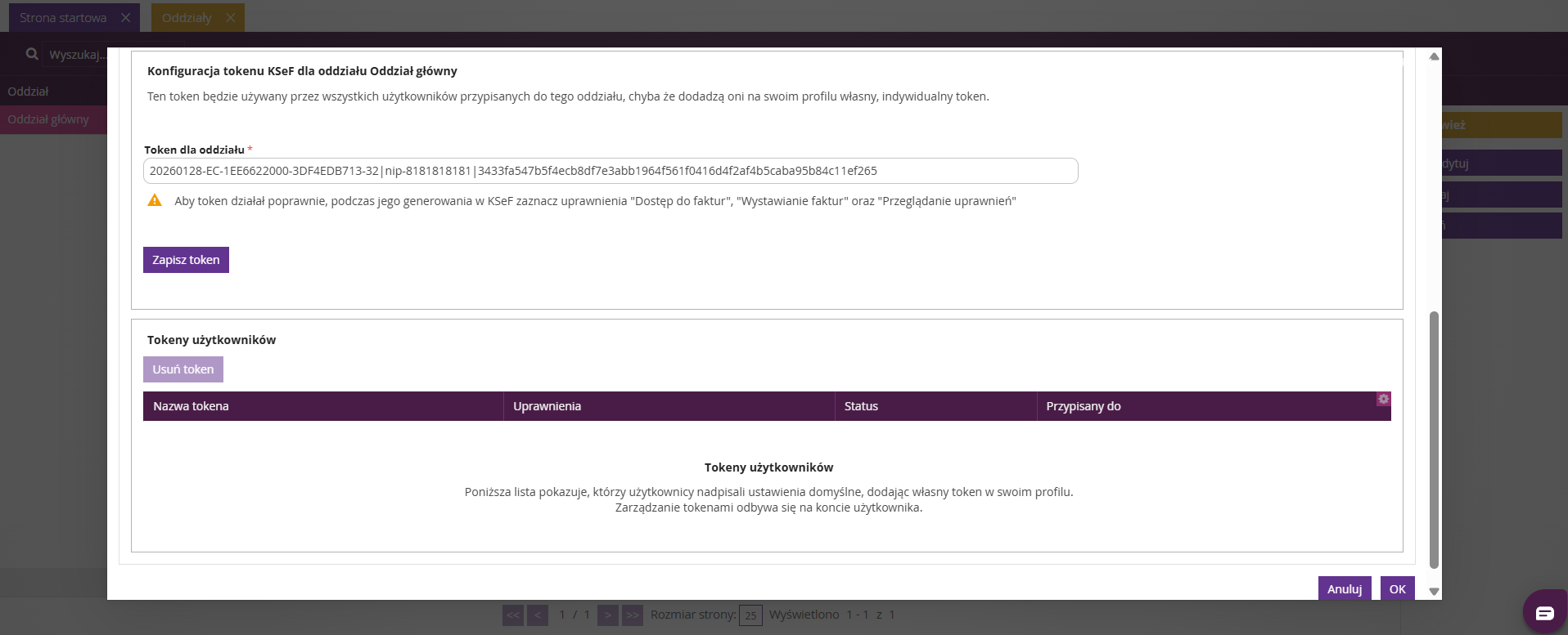 W widoku edycji oddziału, w zakładce KSeF, dostępna jest sekcja Tokeny użytkowników, która:
